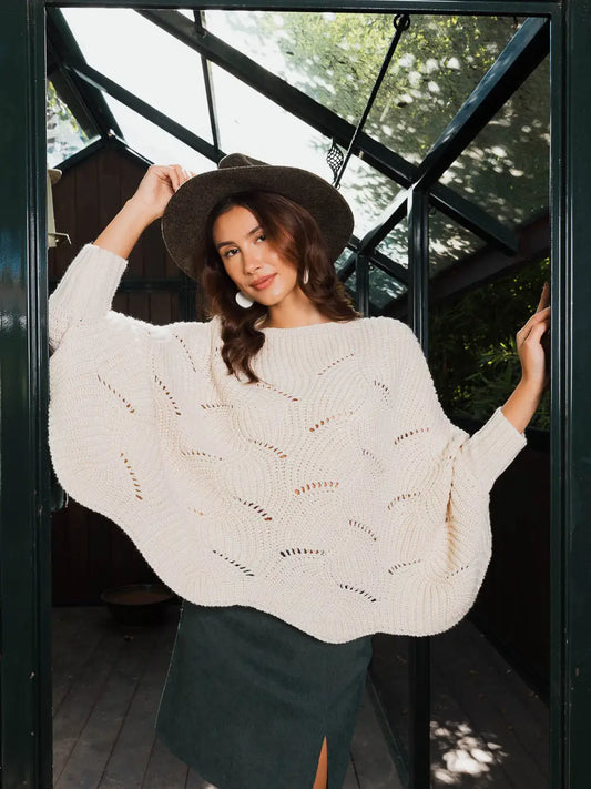 Autumn Butterfly Ribbed Poncho Sweater (Burgundy & Cream)