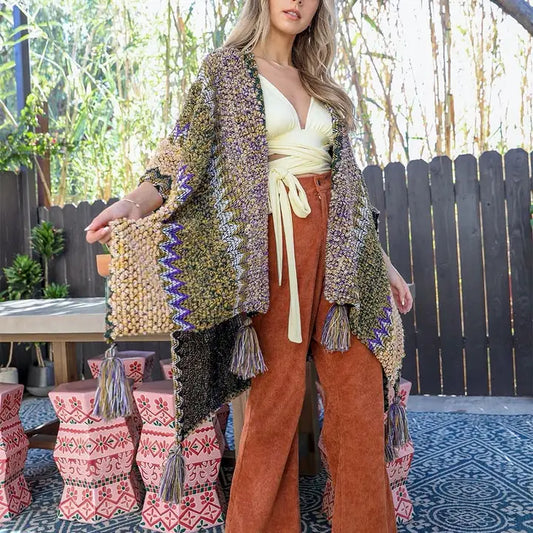 Open Work Bohemian Ruana (Lilac Gray, Cream, Rust)