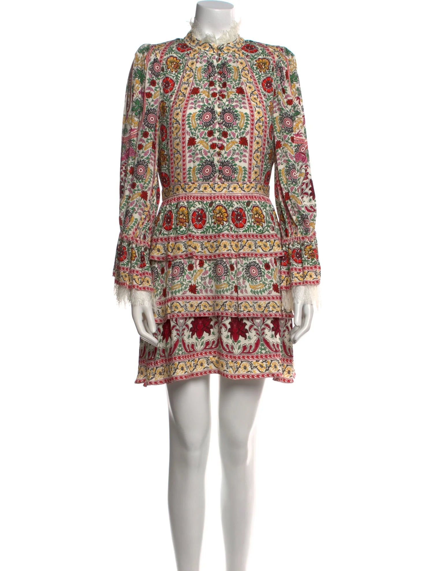 Its long sleeves and high, softly gathered neckline balance beautifully with the short, tiered skirt, creating a silhouette that’s both modest up top and playful below. Delicate ruffled detailing and subtle pleating add movement and texture, while the mini length keeps it fresh and flirty rather than nostalgic.