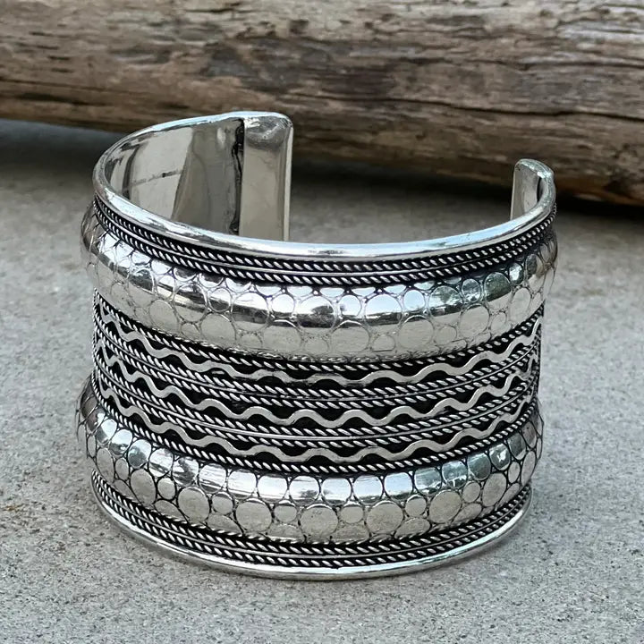 This lovely brass silver plated cuff bracelet hand crafted in our studio located in India features Vintage design on the band, measures 2 Inches wide and can be adjusted to fit most wrists.