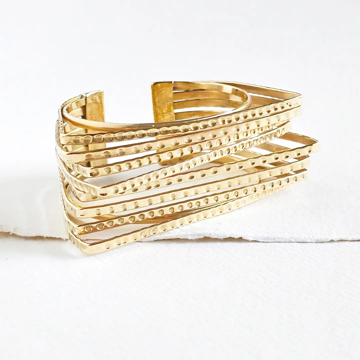 Handcrafted layered bold dotted hammered brass cuff bracelet. Bisjoux exclusive design. Wearable Art. Adjustable Handmade solid brass. Logo Engraved and arrives in logo drawstring protective pouch