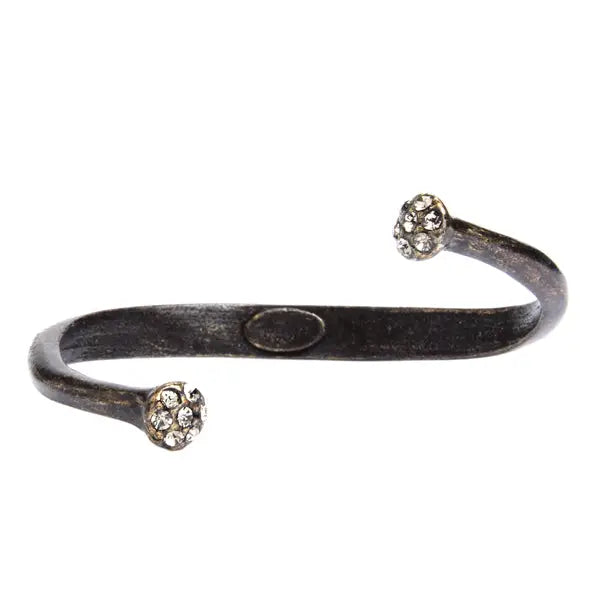 Rebel crystal tip stackable bangle bracelet. Antique brass finish with black diamond crystals. Handmade in New York. Style #1925