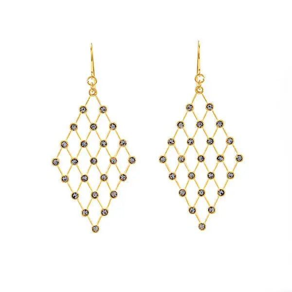 Rebel diamond lattice crystal earrings. 18K gold finish with black diamond crystals. Handmade in New York. Style #RR519.