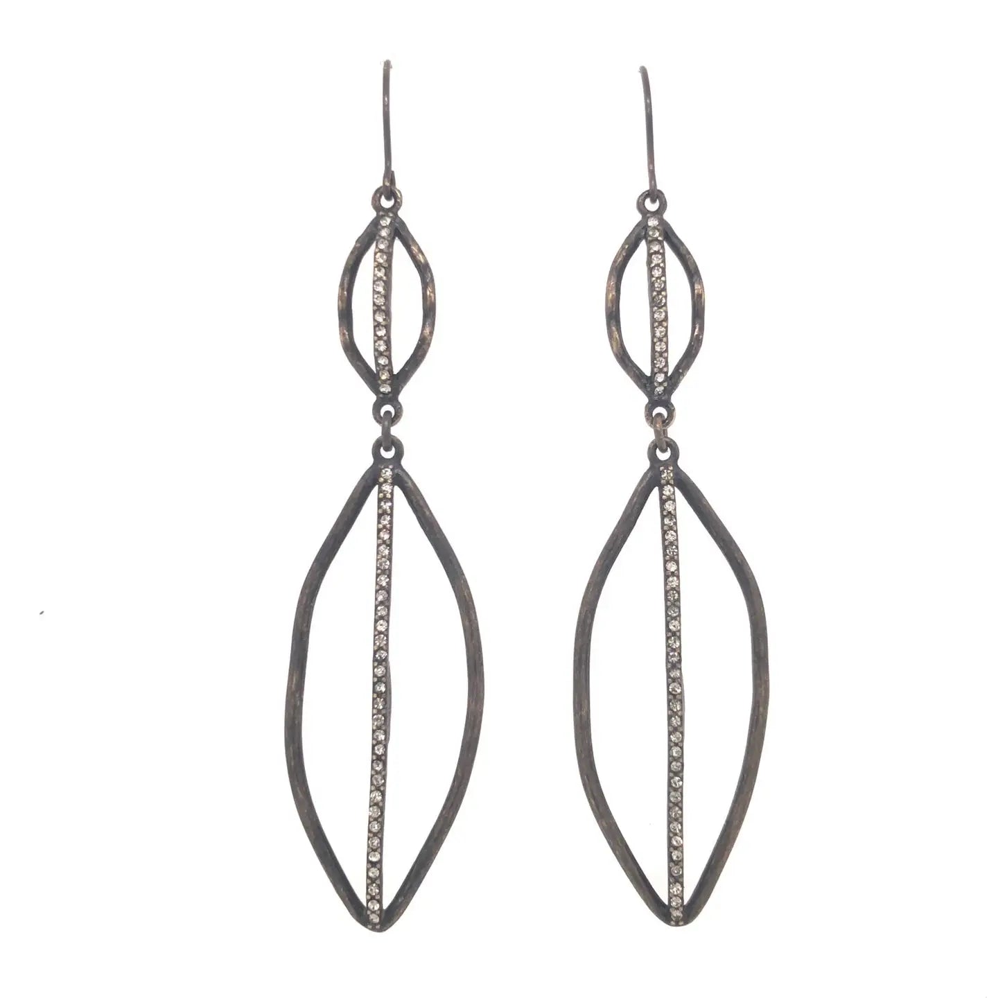 Double crystal leaf earrings. Antique brass finish with black diamond crystals