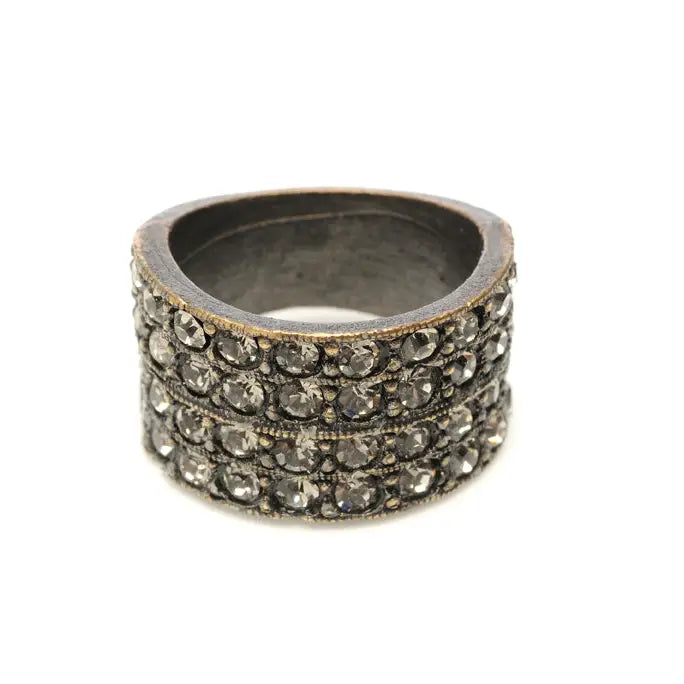 4-row crystal band ring. Antique brass finish with black diamond crystals stones.