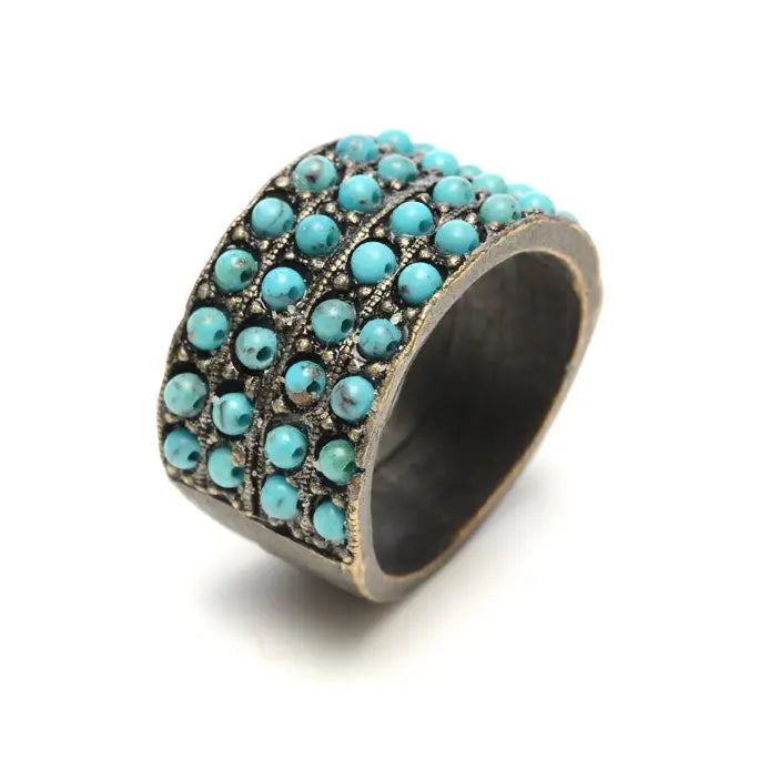 4-row crystal band ring. Antique brass finish with black diamond crystals stones.