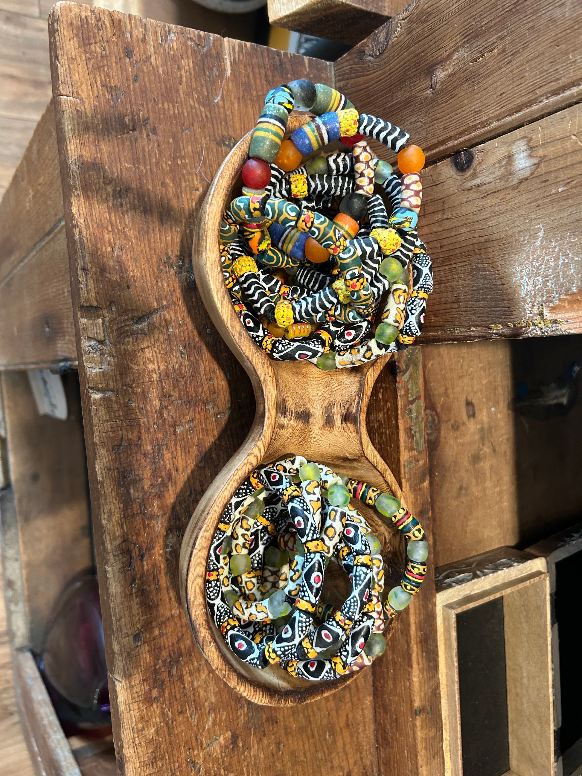 This vibrant set of handcrafted bracelets is a celebration of African heritage and artistry. Featuring a striking mix of bold patterns, recycled glass beads, and vivid colors, each bracelet tells a unique story. The zebra-striped elements evoke strength and unity, while the hand-painted Krobo beads from Ghana add layers of cultural significance and individuality.