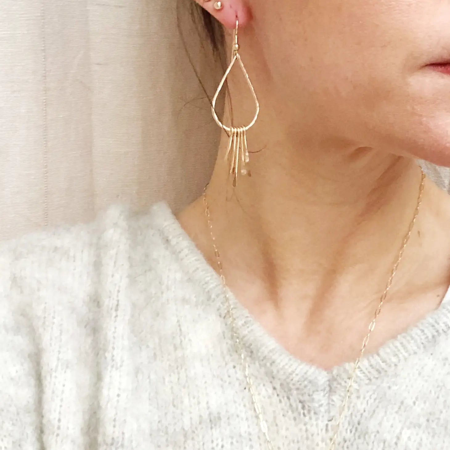 A stunning handcrafted earring that is 18k gold filled components contain 100 times more real gold than simply gold-plated components and are very durable and anti-tarnish. There is no risk of peeling off. Gold filled jewelry is a beautiful, affordable alternative to solid gold and can be worn by those with sensitive skin.