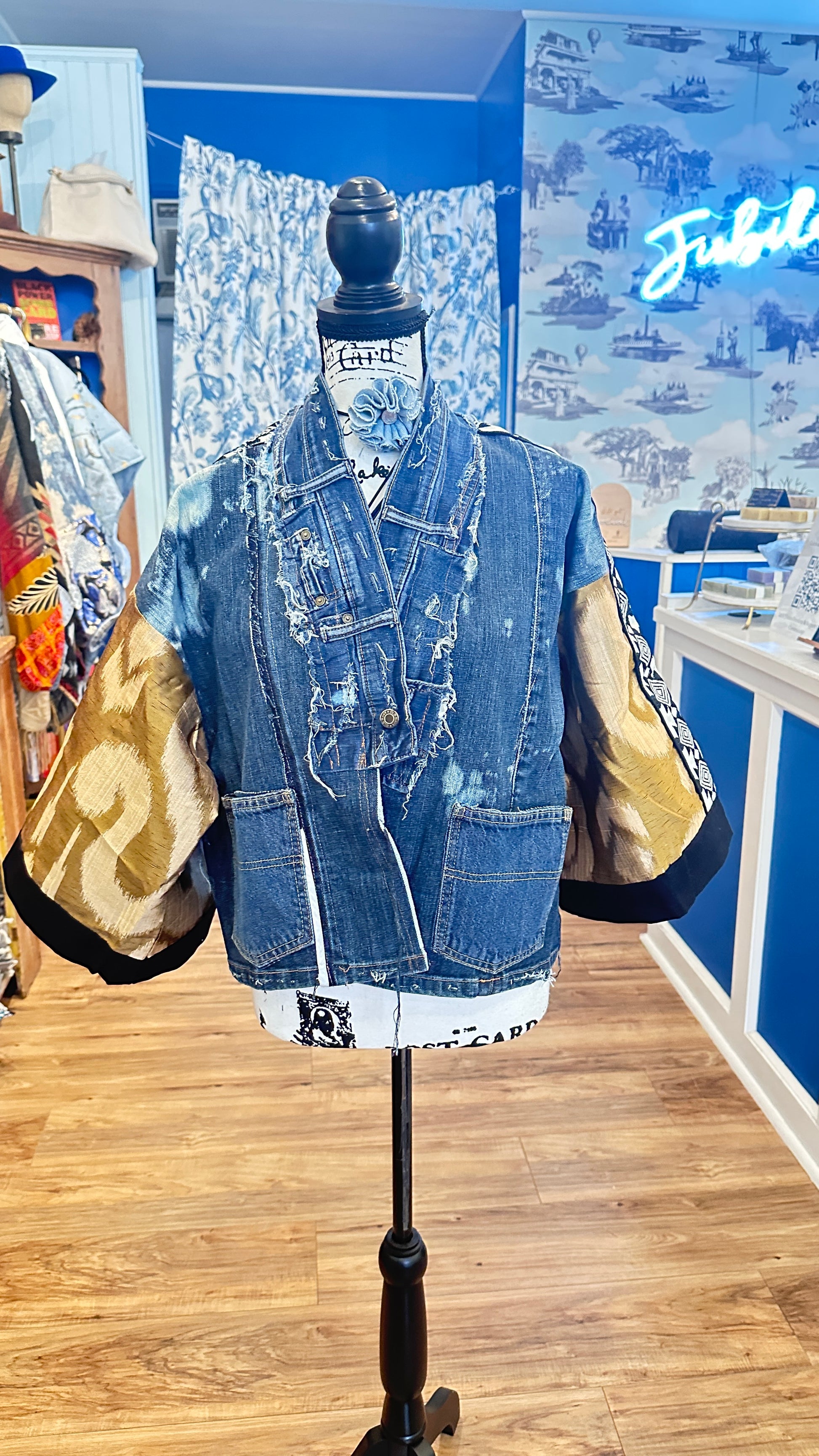 Gold and bronze paisley-inspired brocade sleeves with dark denim structure.