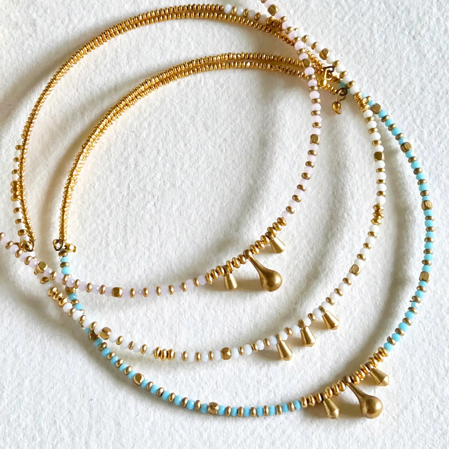 Handmade micro brass and glass beaded spring wire collar necklaces in assorted styles and color.