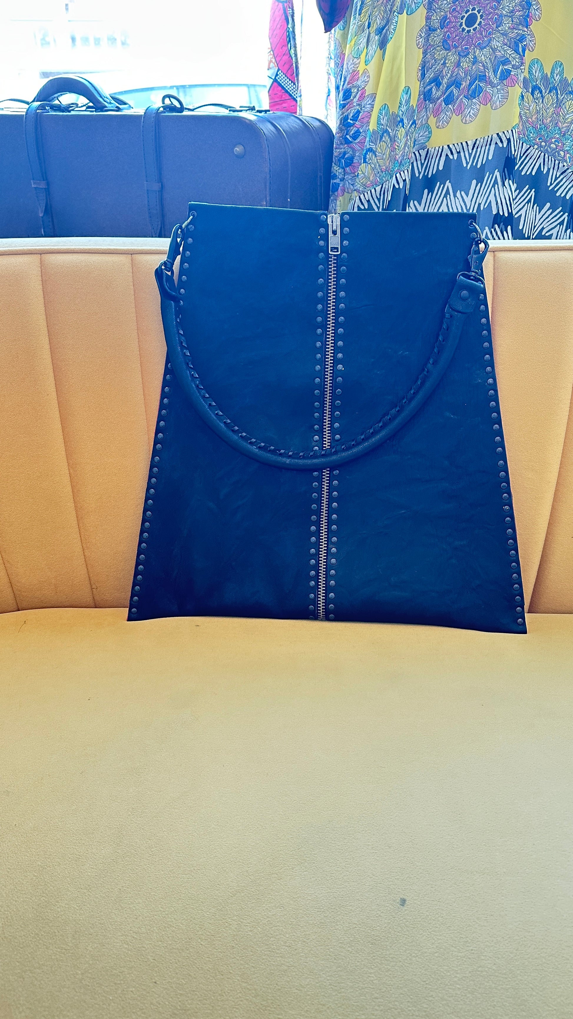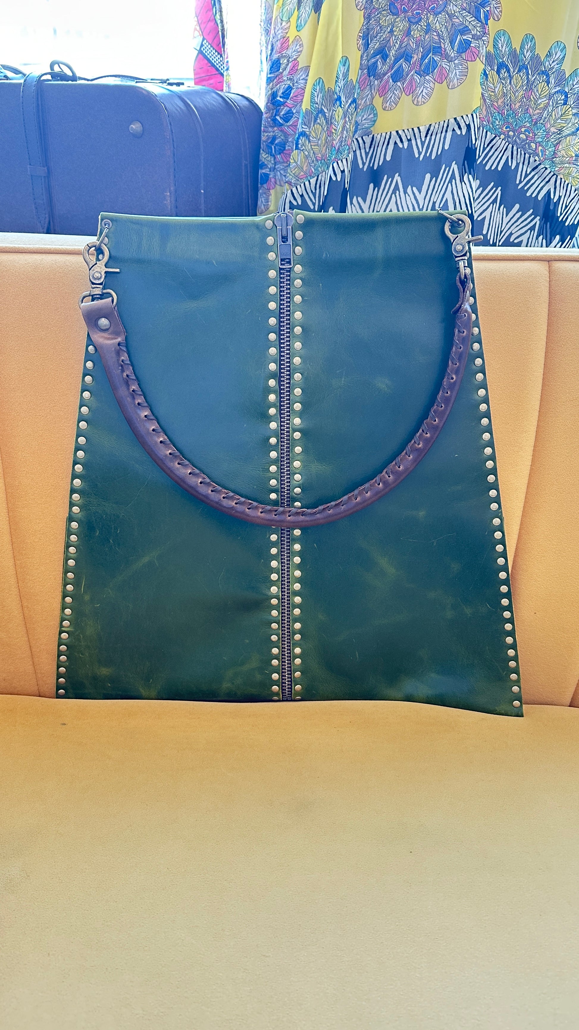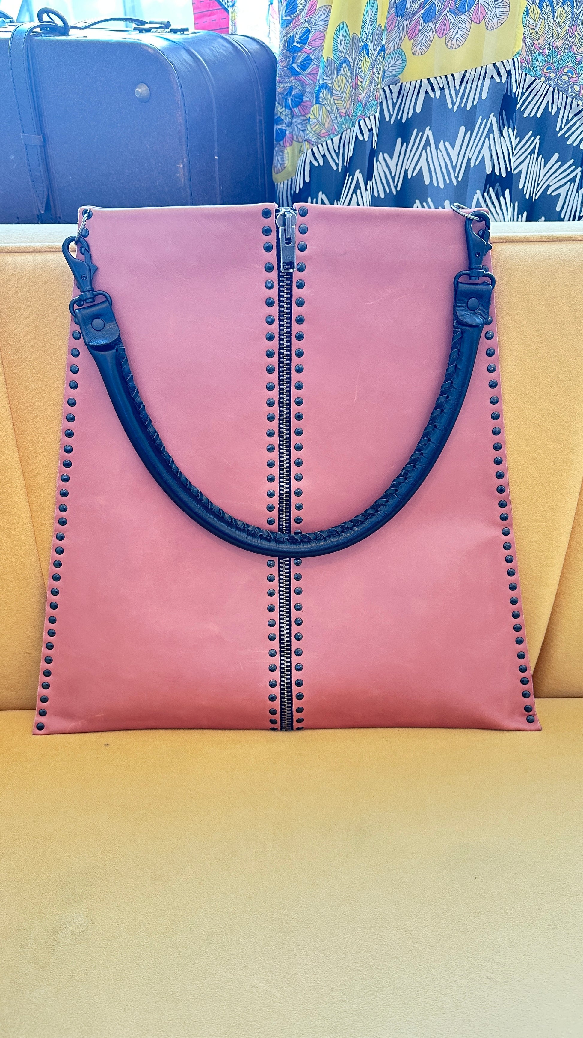 Rebel signature large zipper bag. Genuine Italian leather with suede lining, two interior pockets. Hidden magnetic snap closure. Removable tube shoulder strap. 18"x17", 11" handle drop. Handcrafted in Brooklyn.
