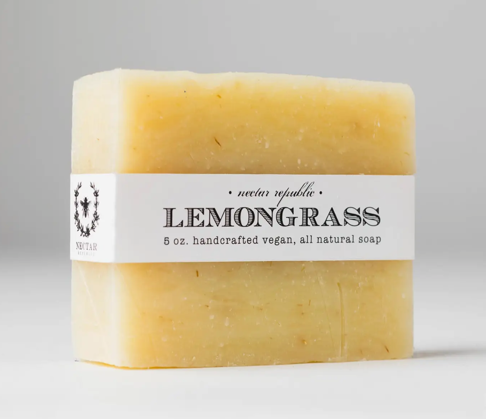 5 oz. Handcrafted vegan, all natural soap + muslin soap bag AROMA: rejuvenating citrus scent with earth underlines BENEFITS: Lemongrass relieves itchy, irritated and skin. Tightens and smooths the skin as well as eliminates body odor. INGREDIENTS: Olive Oil, Water, Coconut Oil, Sodium Hydroxide, Organic Palm Oil, Shea Butter, Lemongrass Essential Oil, Lemongrass Herb.