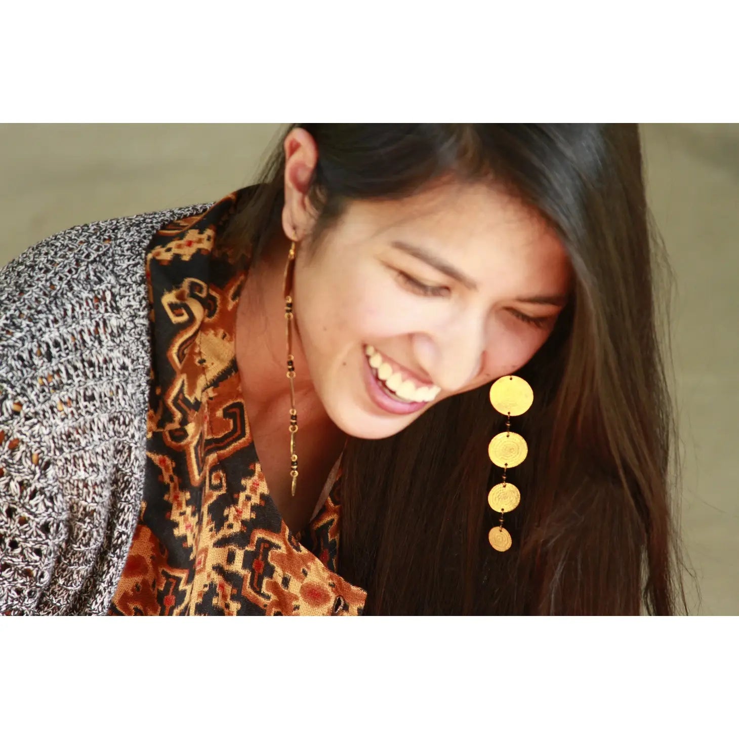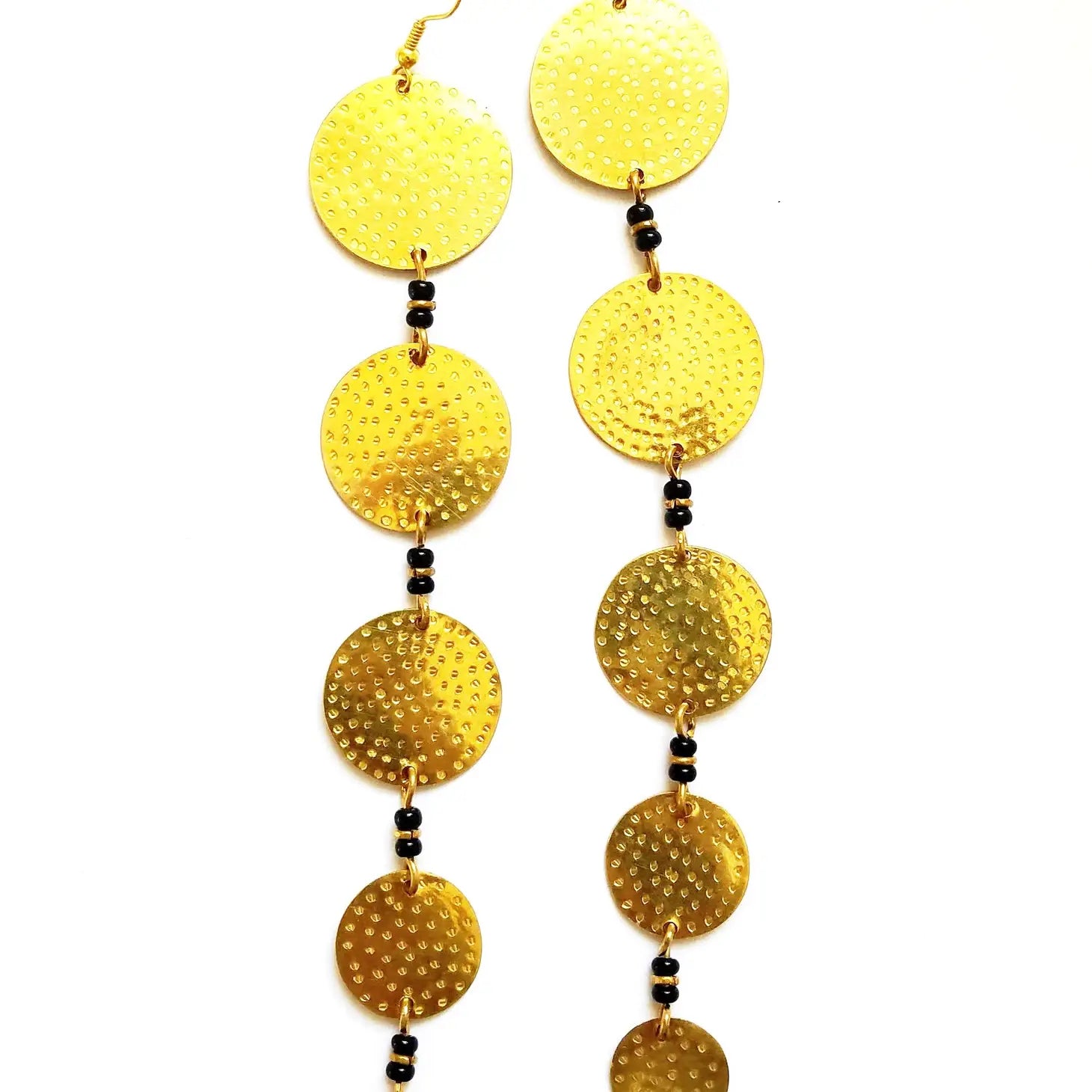 A stunning representation inspired by classic African tribal designs. These earrings are hand embossed and handcrafted these earrings represent five tier circles made of 100% brass. Earrings have a 6-inch drop.