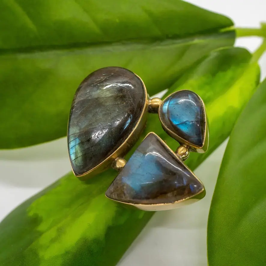 Natural stone cluster ring with labradorite stones. Our brass collection is a mix of entirely handmade pieces and cast designs, with all details being hand carved. Made by skilled metalsmiths in the Rajasthan region of Northern India. The brass we use is a combination of zinc and copper and is nickel-free.