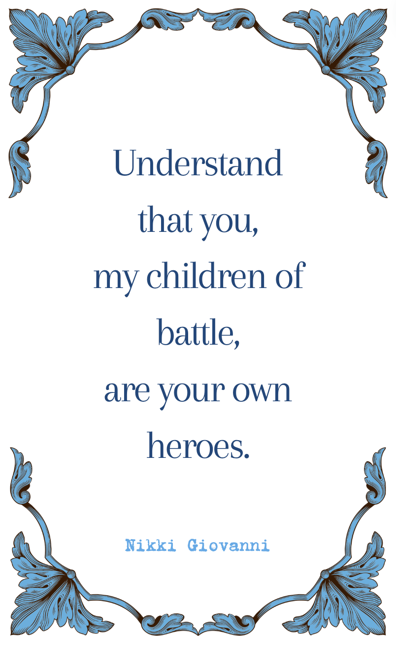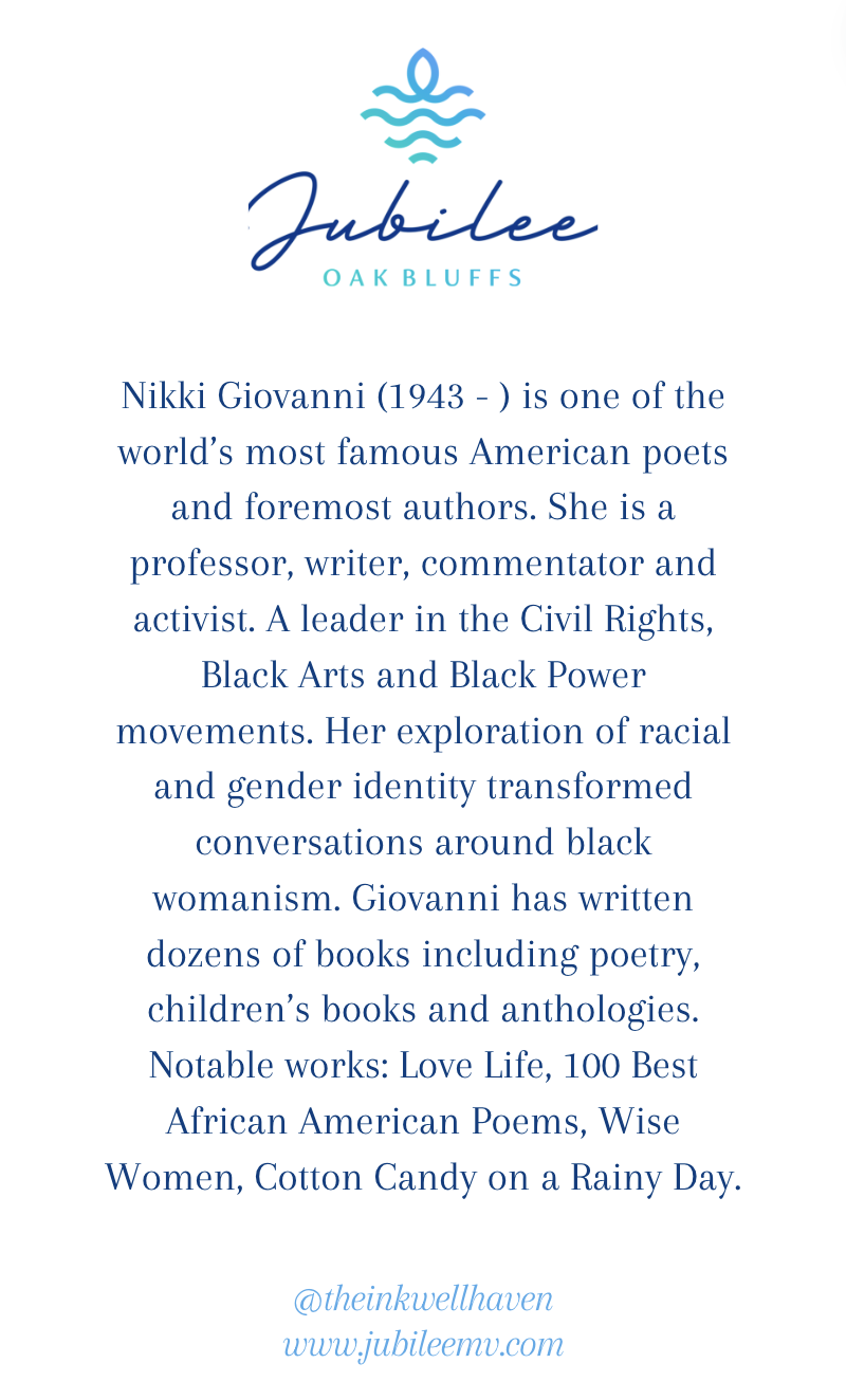 Nikki Giovanni (1943 - ) is one of the world’s most famous American poets and foremost authors. She is a professor, writer, commentator and activist. A leader in the Civil Rights, Black Arts and Black Power movements. Her exploration of racial and gender identity transformed conversations around black womanism. Giovanni has written dozens of books including poetry, children’s books and anthologies. Notable works: Love Life, 100 Best African American Poems, Wise Women, Cotton Candy on a Rainy Day.
