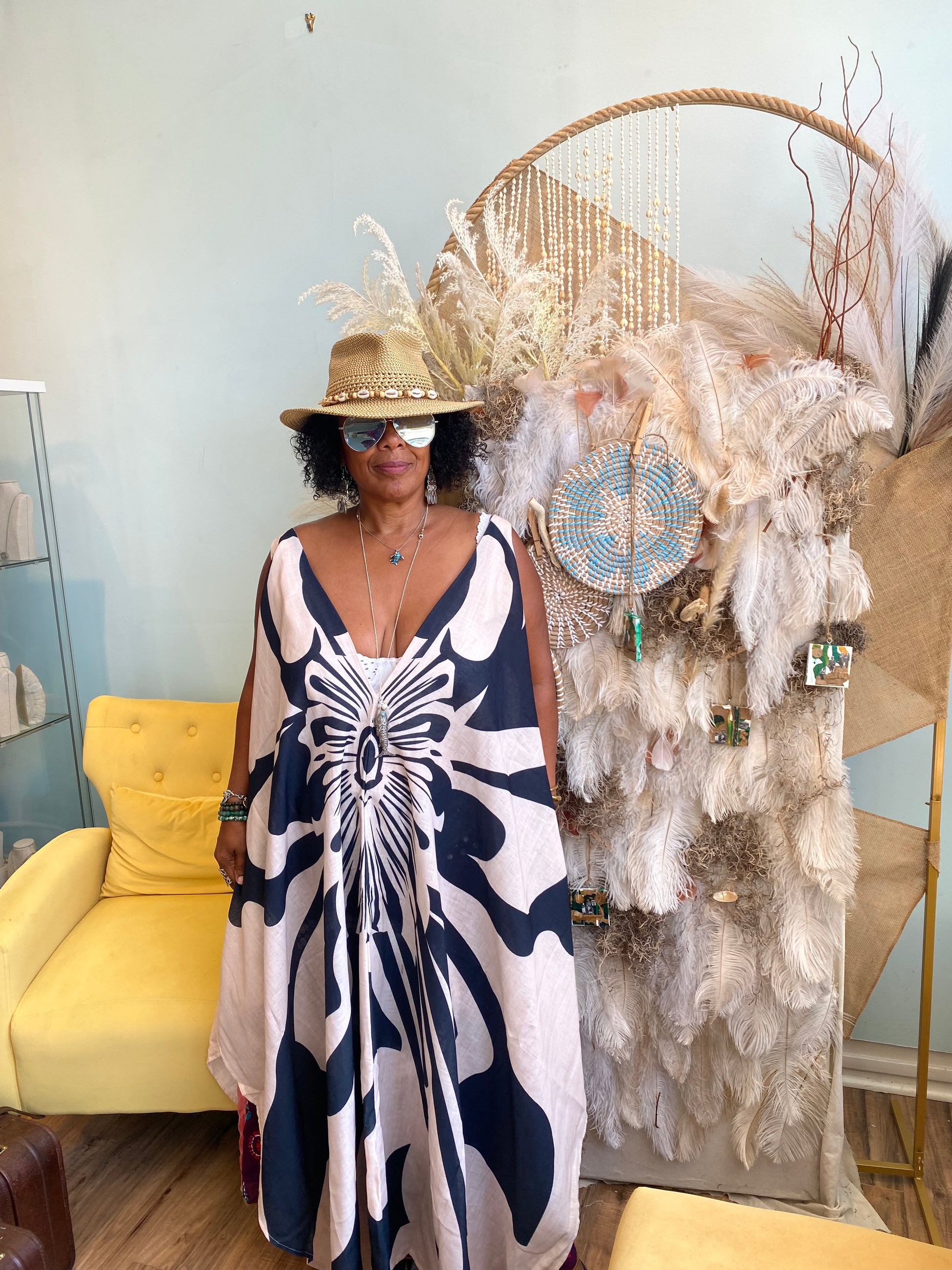A bold breezy statement piece inspired by the flow of nature and coastal charm. This free-flowing kaftan features a dramatic navy and ivory floral burst design.