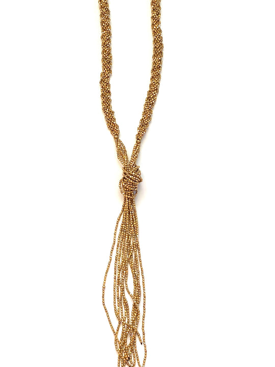 Layer on the glamour with the Ojas Brass Necklace! This stunning statement piece will turn heads with its eye-catching brass beads and knotted, draped design. Crafted with great quality, this long layered necklace will have you looking and feeling fabulous! -Brass beaded. Made in India.