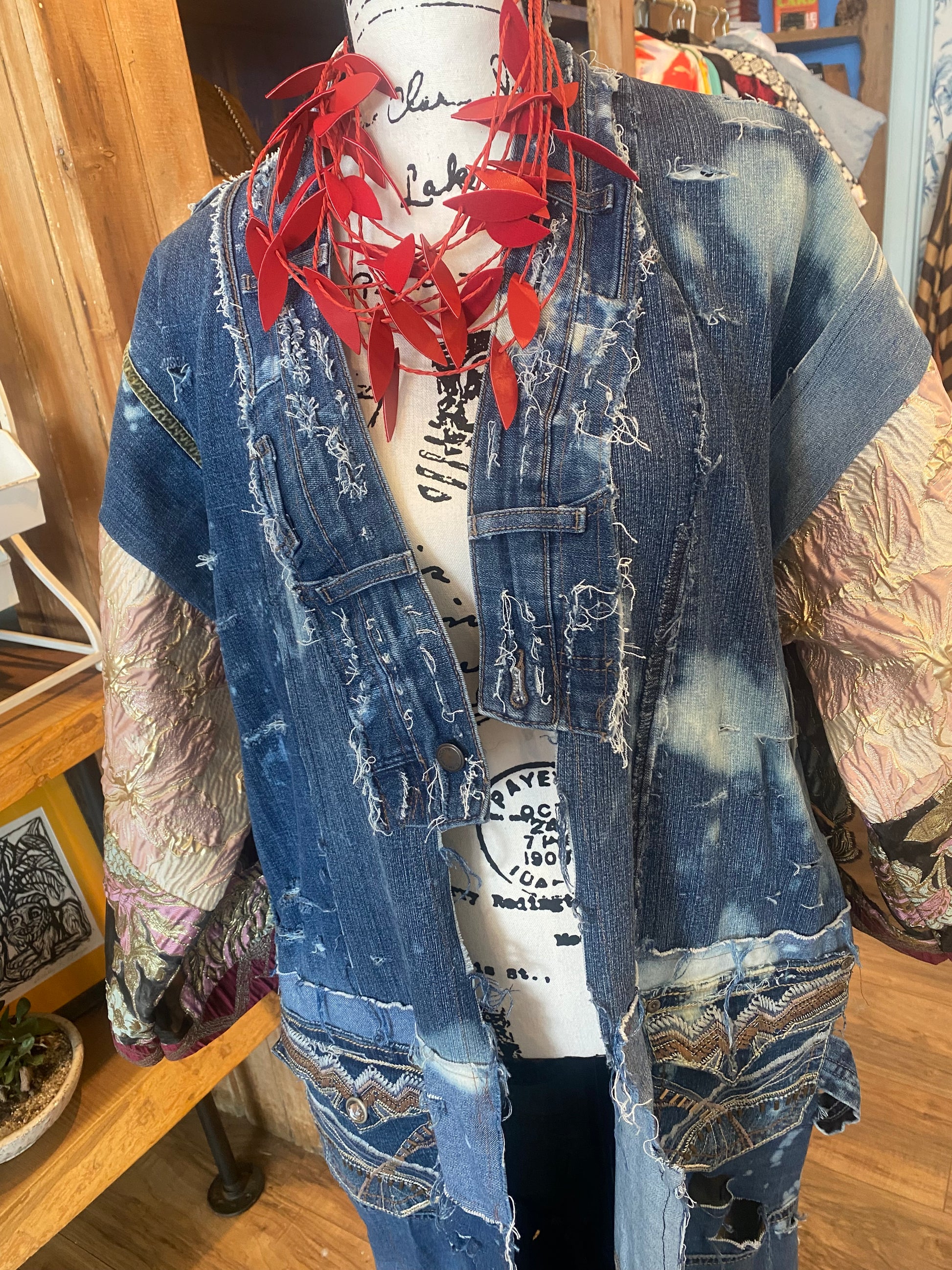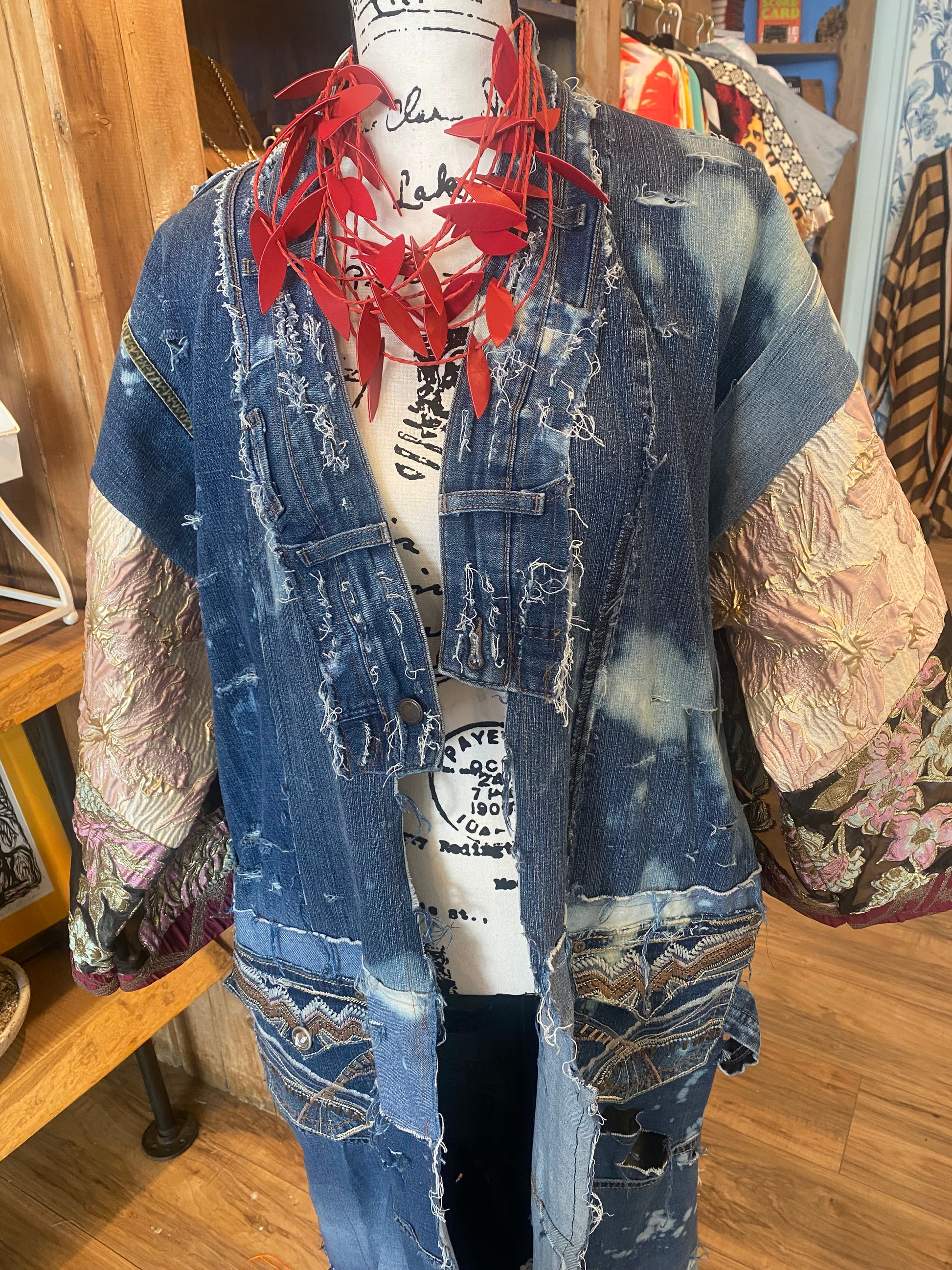 Handcrafted one of a kind piece by renowned fabric artist LaSonja Polk created exclusively for Jubilee MV. Patchwork Petal is where renowned craftsmanship meets delicate beauty. This kimono-style jacket is a celebration of contrasts—crafted from repurposed denim in rich, varying washes and heavily distressed textures, it’s grounded in grit and authenticity. But it's the voluminous brocade sleeves, blooming with floral embroidery in soft metallics and romantic hues, that bring the unexpected grace. Like petals stitched onto weathered fabric, each panel tells a story of resilience and renewal. Designed for the free spirit with a love for bold expression and layered narratives, Patchwork Petal is wearable poetry—wild, worn, and unapologetically beautiful.