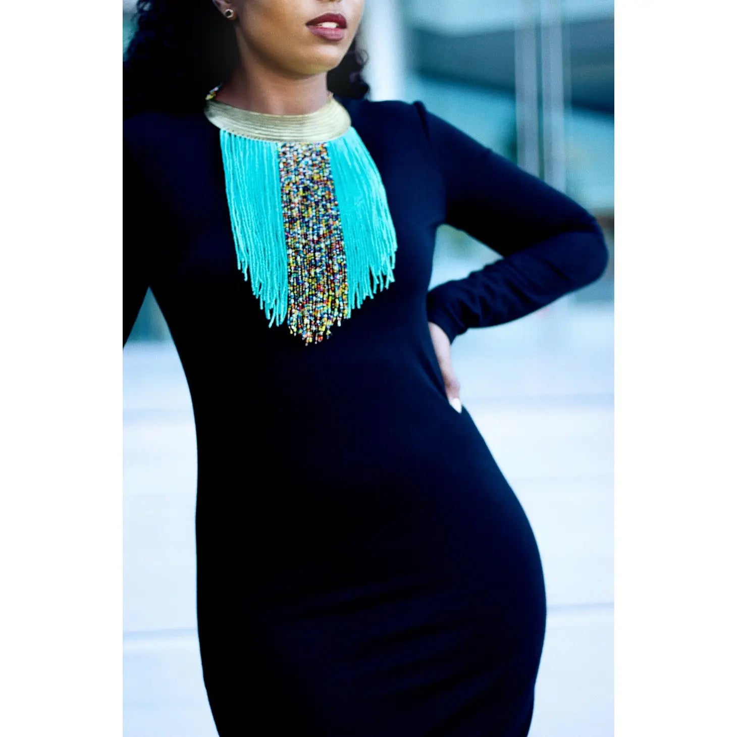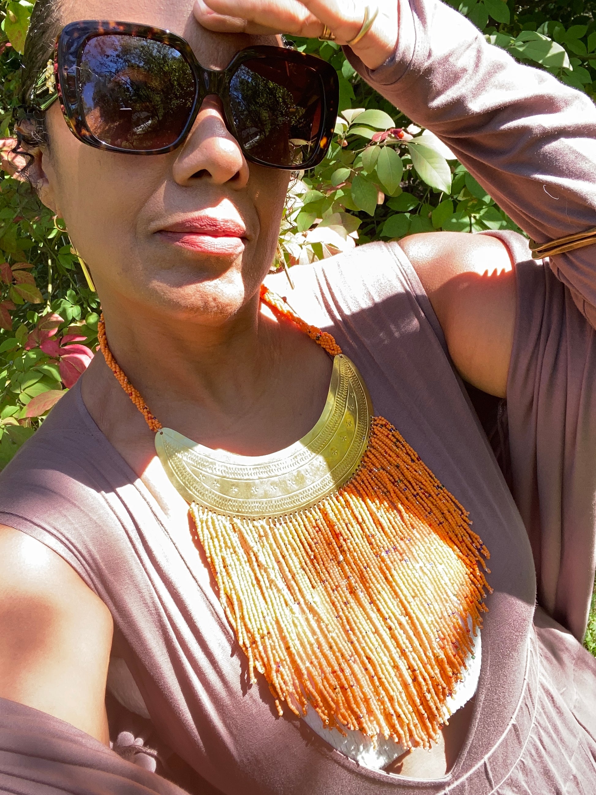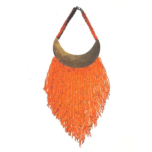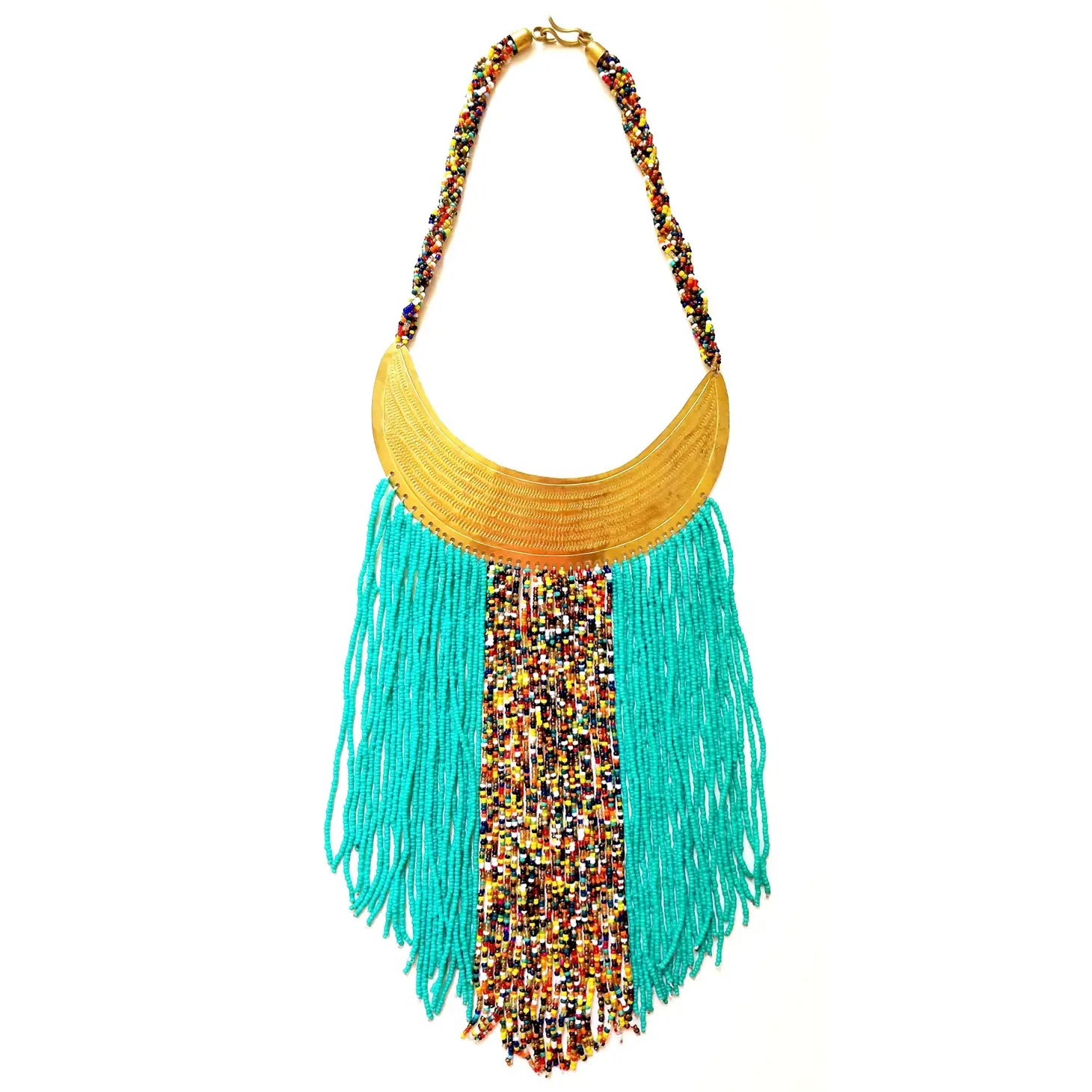 A unique pairing of brass, beads and bright colors. This fringe necklace is a great statement piece. "Pendo" means "love" in Kiswahili.