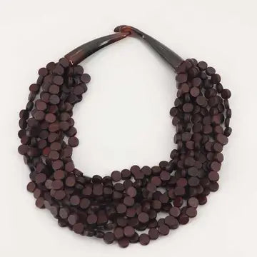 Imbue your wardrobe with the depth and richness of this necklace, featuring multiple strands of rich brown wood discs. The strands are intricately twisted to create a stunning layering effect that exudes sophistication and warmth. The eye and hook closure, crafted from horn, ensures a seamless fit, while the deep brown hues provide a versatile accessory for any season.
