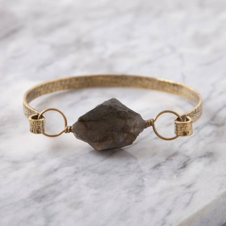 Rough cut labradorite bangle bracelet. Our brass collection is a mix of entirely handmade pieces and cast designs, with all details being hand carved. Made by skilled metal smiths in the rajasthan region of northern india. The brass we use is a combination of zinc and copper and is nickel-free.