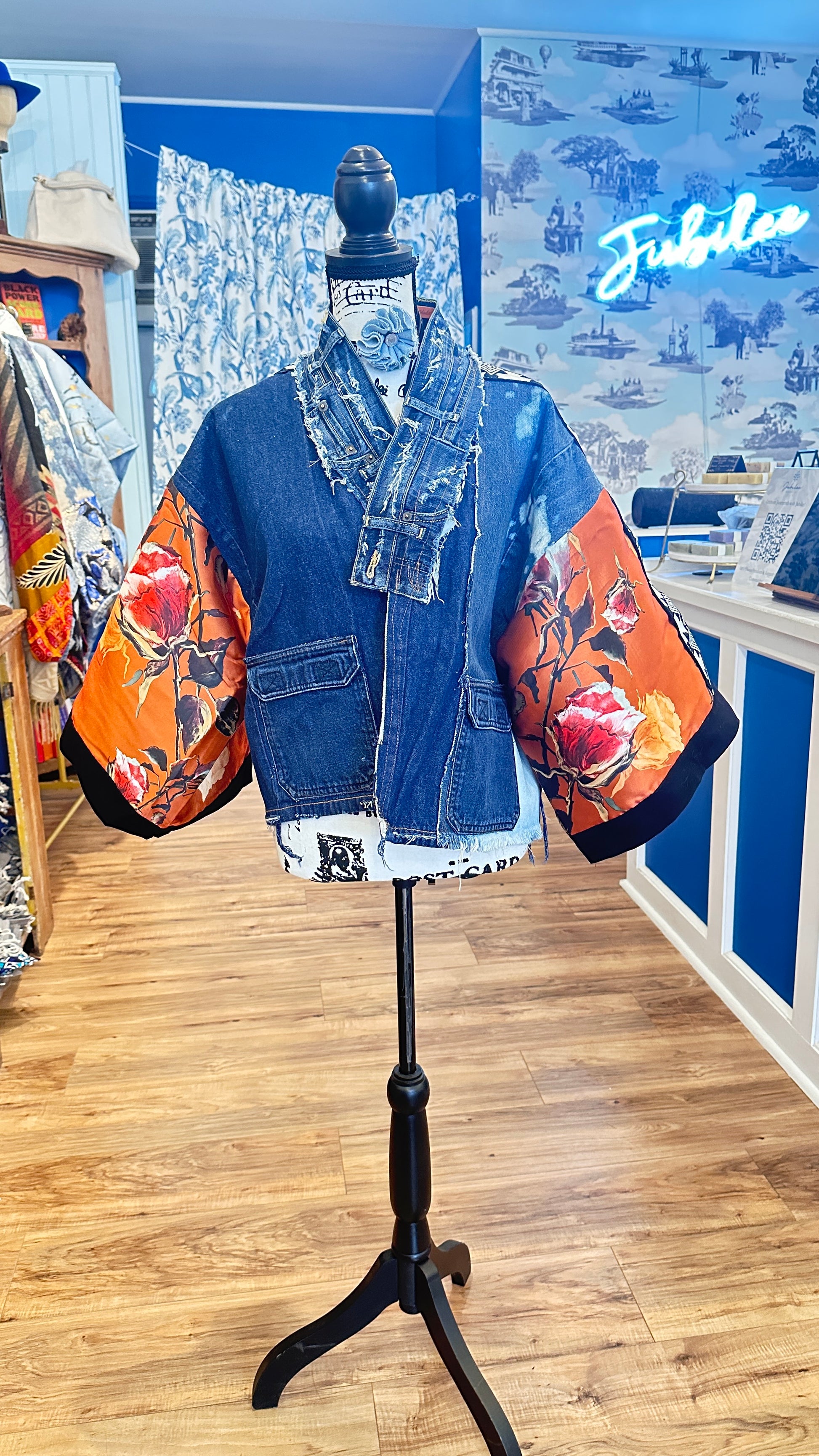 Bold red and orange rose print contrasting beautifully with raw denim