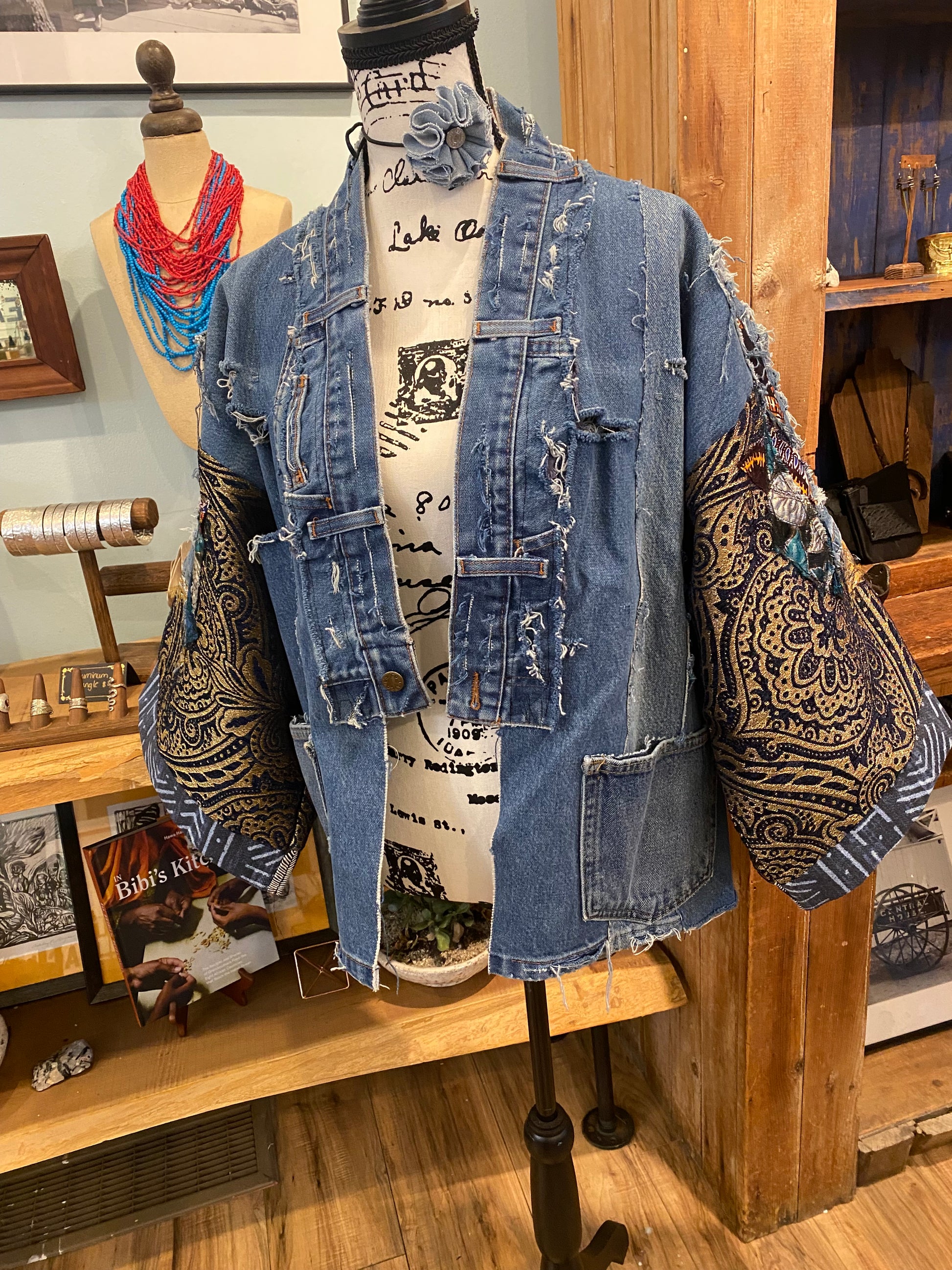 Introducing the One-of-a-kind Denim Kimono, by our favourite LaSonja Polk—a fusion of timeless denim and contemporary design. This oversized kimono is meticulously handcrafted using a blend of recycled denim, linen, silk, and cotton, ensuring each piece is as unique as the stories it carries. The combination of raw edge finishes and appliqué detailing adds a touch of artisanal charm to this modern classic.