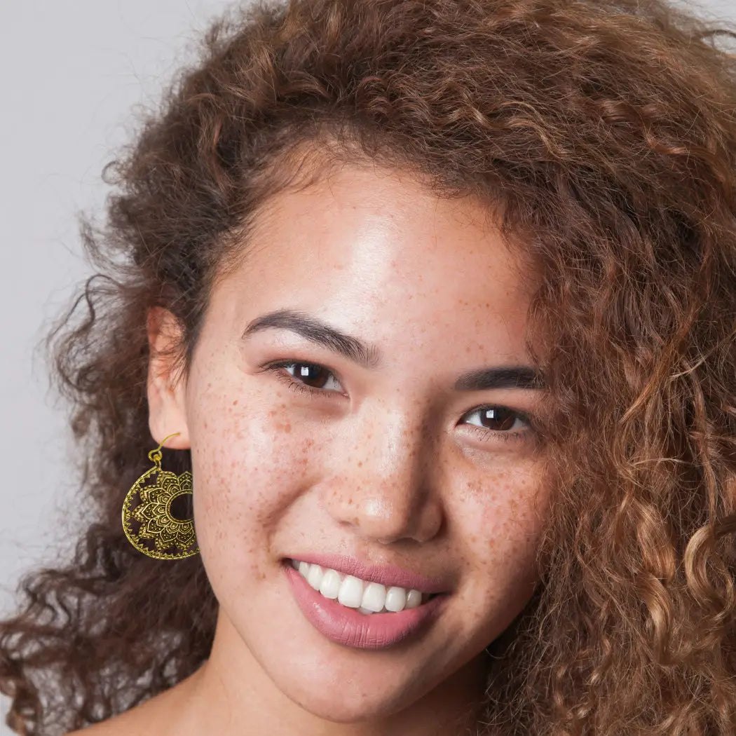 A beautiful pair of earrings with an ancient floral motif reminiscent of the mandala. These handcrafted pieces are a perfect addition to your earrings collection. Brass 2" handcrafted in India.