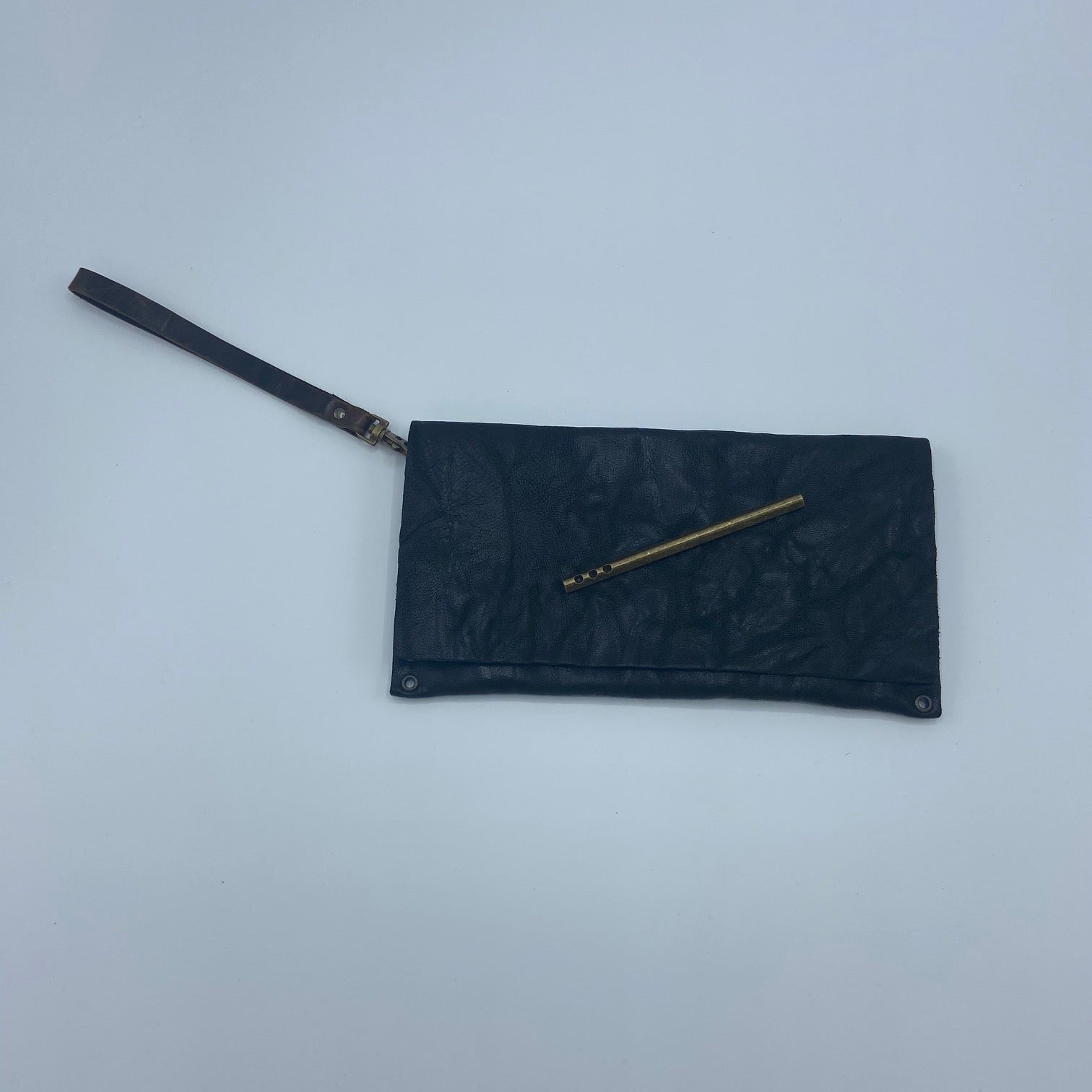 Rebel single bar wristlet clutch. Genuine Italian leather, goat skin with suede lining. Antique brass studs and hardware. Magnetic snap closure. Style #C32.