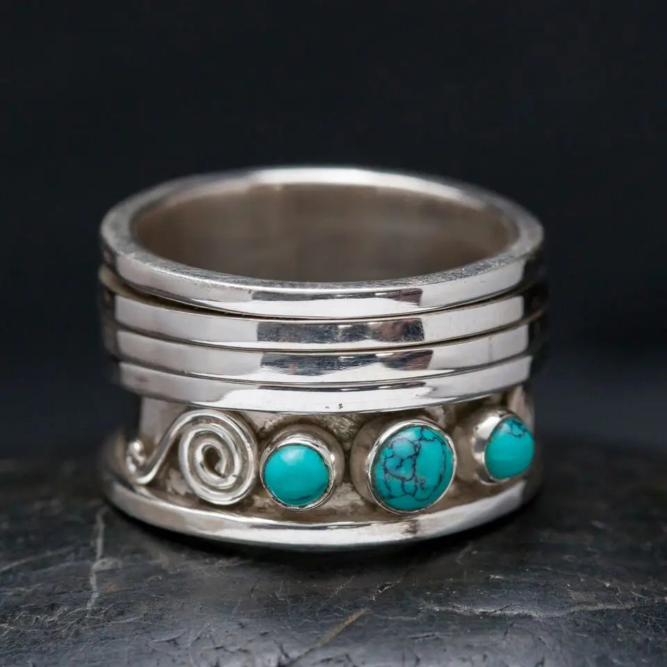 Sterling silver spinner ring with three center turquoise stones with three silver spinning bands.