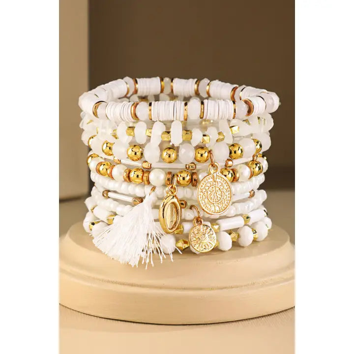 Beautiful beaded stretch and stack bracelet set *Metal/Tassel/Pearl/Glass *Nickel/Lead Compliant *APPROX. L 8" Diameter 2.25" 1.37oz.