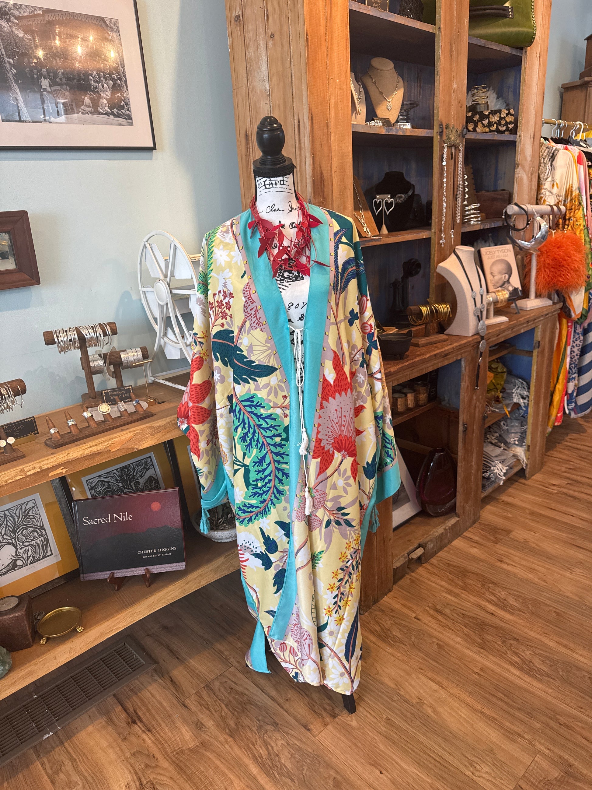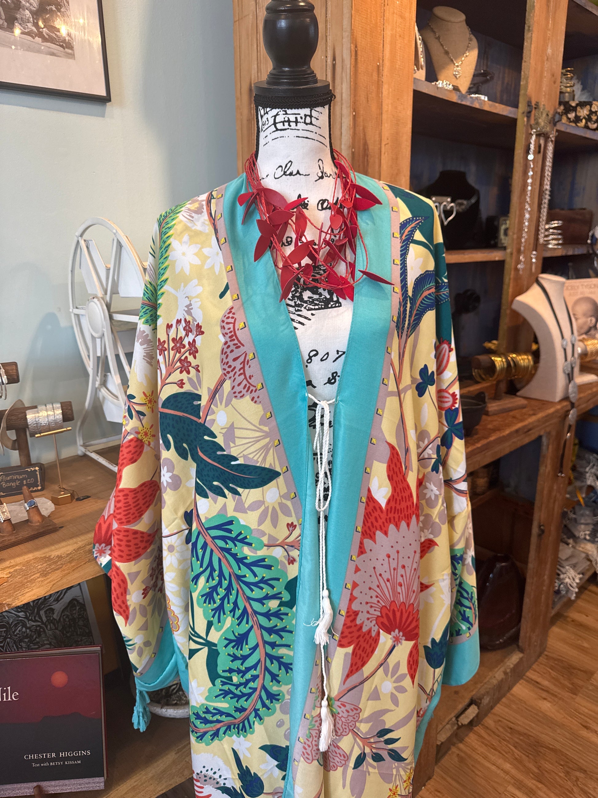 Step into a dreamscape of lush botanicals and sun-kissed serenity with the Tropical Reverie kimono. A stunning palette of teal, coral, citrus yellow, and leafy green dances across this airy silhouette, evoking the essence of an exotic garden at golden hour. Framed with a vibrant aqua trim and finished with a tasseled tie, this kimono radiates effortless sophistication and playful charm.