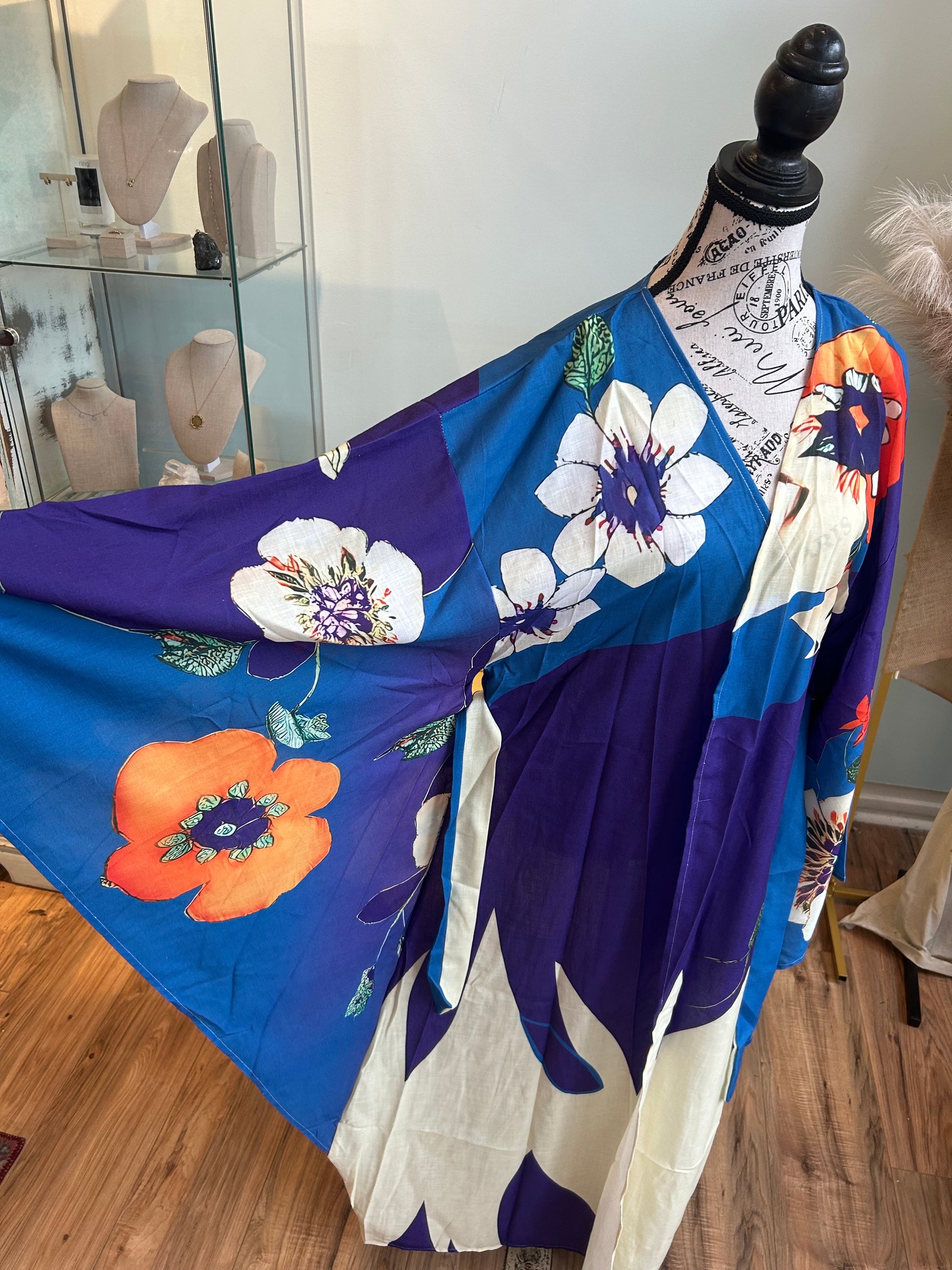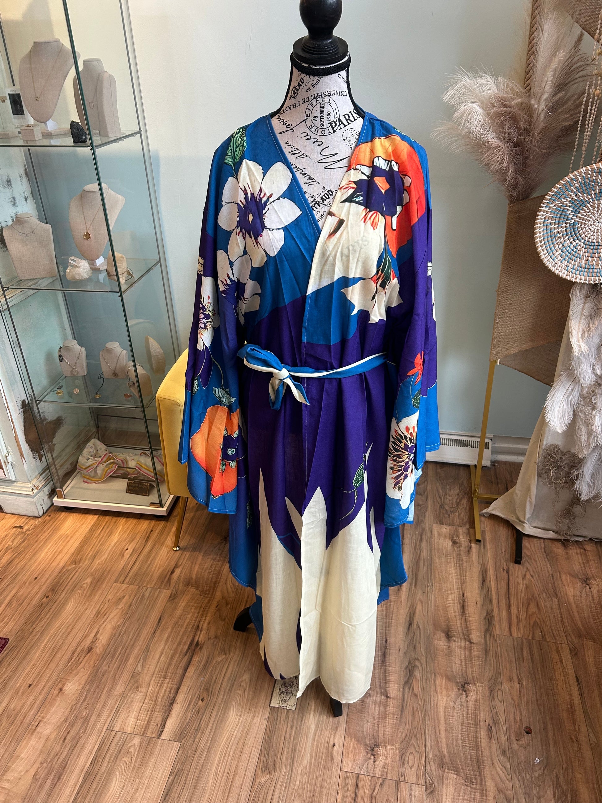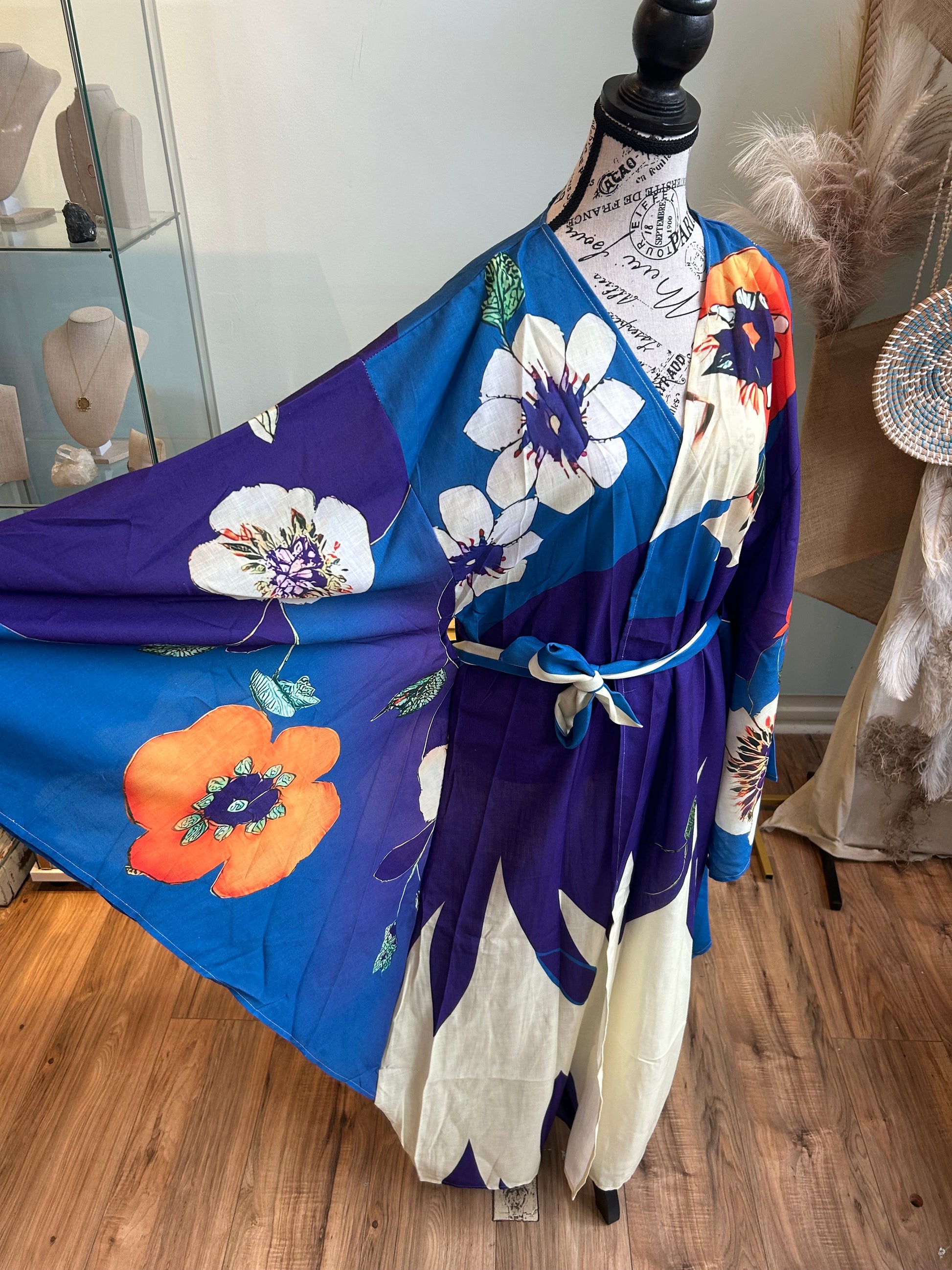 Bold and luminous, the Twilight Garden Kimono captures the enchanting moment where day melts into night. With a rich palette of deep violet, electric blue, and vibrant tangerine, this piece bursts with oversized floral motifs that feel both tropical and timeless. The contrast of bright blooms against the dark background evokes a moonlit garden alive with color and possibility. Finished with a delicate sash belt for an adjustable fit, this kimono is perfect for evening soirées, artful lounging, or adding a splash of drama to your daytime look. The Twilight Garden is where elegance meets bold self-expression.