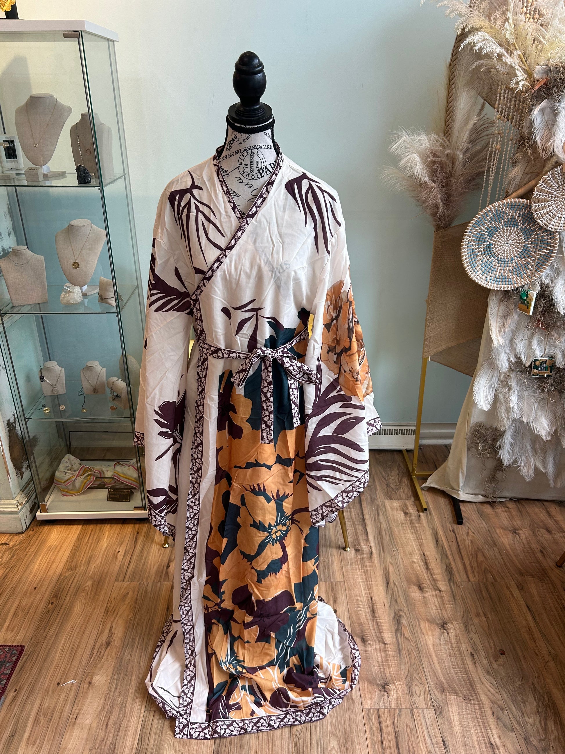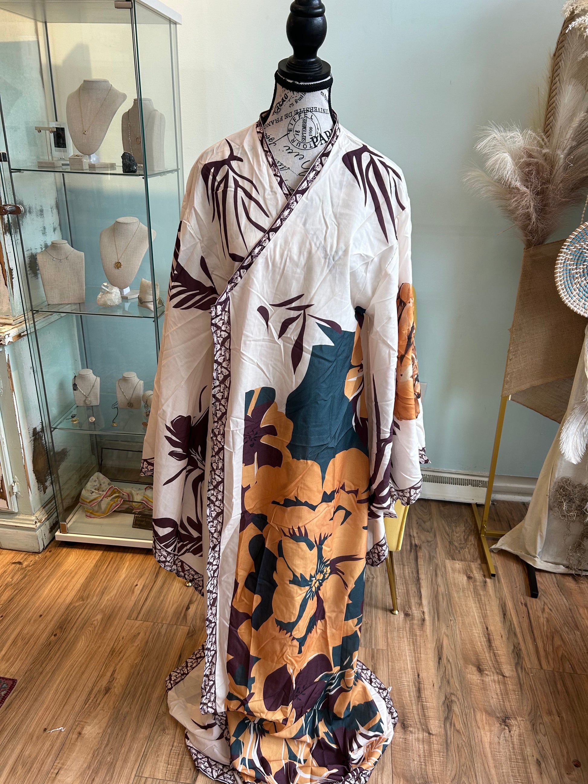Rich and dramatic, the Twilight Hibiscus Kimono wraps you in the essence of dusk in a tropical garden. Bold floral motifs in deep amber, indigo, and plum burst across a soft, cream backdrop—echoing the last golden light filtering through hibiscus leaves at sunset. The elegant contrasting trim adds a refined edge, while the flowing silhouette evokes timeless grace. This kimono is ideal for elegant lounging, creative layering, or making a quiet but confident statement wherever you go. Twilight Hibiscus invites you to embrace the poetic stillness of evening with flair and femininity.