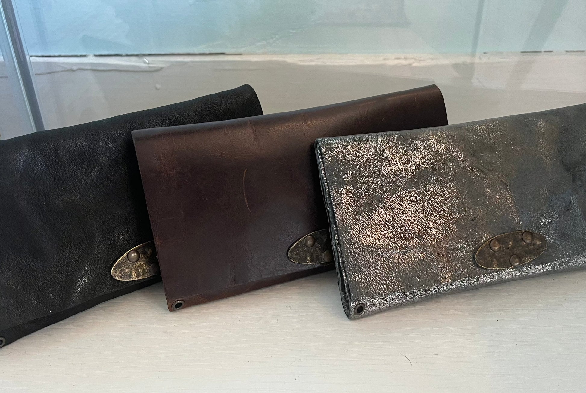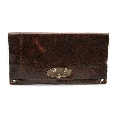 Rebel signature unconstructed wallet. Genuine Italian leather with antique brass hardware. Magnetic snap closure. Two interior compartments. Handmade in Brooklyn. Style #W1.