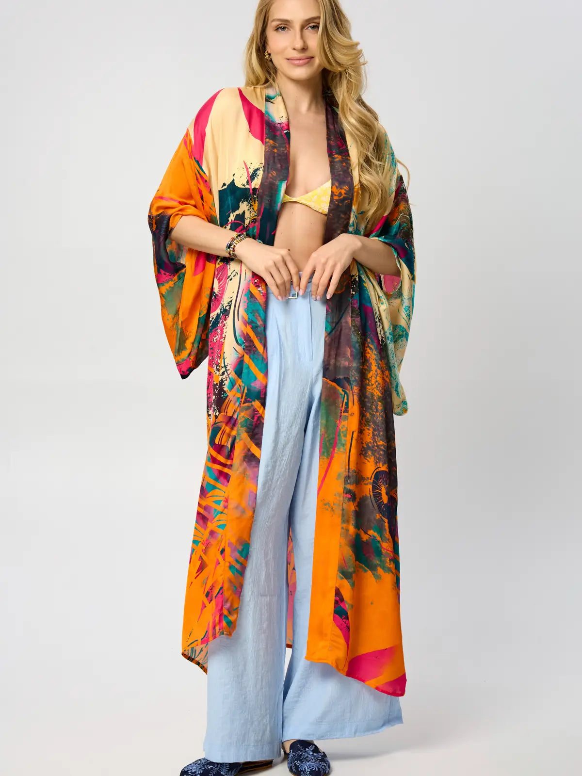Our Vibrant Satin Kimono with abstract detailing features traditional kimono sleeves with modern floral motifs for a dash of electric flair. These polychromatic designs fill this flowy, relaxed kimono to give equal parts style and comfort. Style our kimono with a dress or casual outfit to indulge in a silky sensation all year round. -Material: 100% Viscose Satin -Length From HSP To Hem: 53.5"" -Sleeve Length: 13"" -Armhole Straight: 13.5"" -Shoulder Seam Length: 24.5"" -Bust 2.5 cm Below Underarm: 24"" -Made In India"