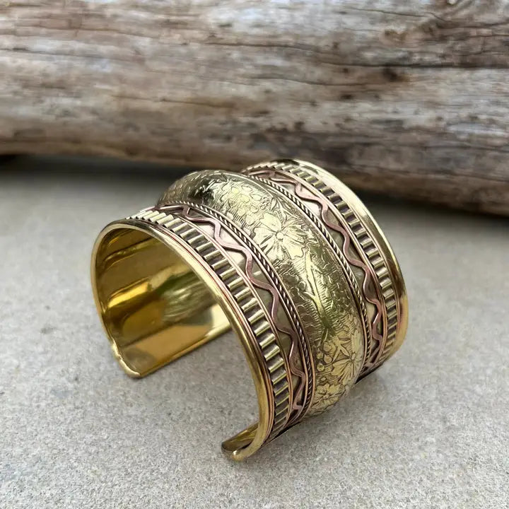 This lovely light weight brass and brass silver-plated cuff bracelet hand crafted in our studio located in India features Vintage design on the band, measures 2 Inches wide and can be adjusted to fit most wrists.