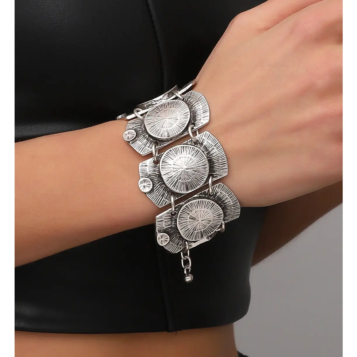 Add a touch of elegance to your wardrobe with this stunning vintage circle bracelet and ring set. Crafted with intricate detailing, this set is a timeless classic that will elevate any outfit. Perfect for a night out or a special occasion, this set is a must-have for any jewelry lover. Handpicked just for you, this set is sure to become a cherished addition to your collection. ► Enhance your vintage jewelry collection with this stunning circle bracelet and ring set. The intricate design of the circle motifs creates a timeless and elegant look. Perfect for adding a touch of retro charm to any outfit. Don't miss out on this unique set that is sure to become a favorite in your accessor ► Material : Silver Plated Zinc & Brass ► Best Option for Party & Festivals ► Bracelet | BRACELET W : 0,65" | L : 7,25" ► Ring | W : 0,65" | L : 0,65" ► Natural Ethnic Hand Crafted ► Fashion Jewelry gift for Women ► Hypoallergenic ► Lead, Nickel, Cadmium free.